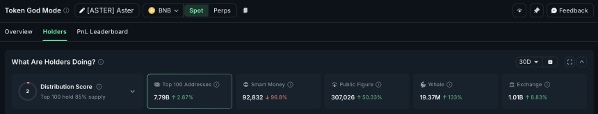 Aster (ASTER) is almost flat in 30 days, up 0.9%, but the whale signal is even stronger. Whale holdings jumped 133%, and top-tier addresses added 2.87% more supply. Retail wallets continue to sell (exchange netflows in green), but whales positioning early is usually the first sign of a sector turning before price follows.
