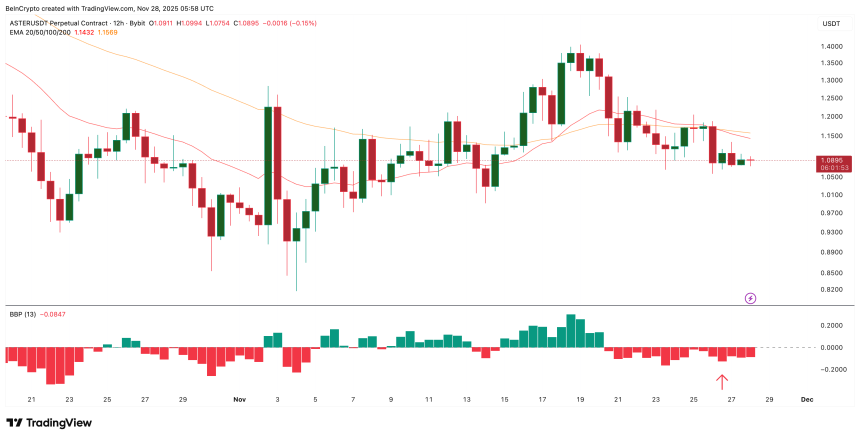 ASTERs 12-hour chart shows a completed bearish crossover between the 20-period and 50-period EMA (Exponential Moving Average), and the bearish power has been decreasing since. When a token with negative BTC correlation shows weakening bearish pressure post bearish crossover, it becomes one of the first candidates to rebound if market conditions flip.