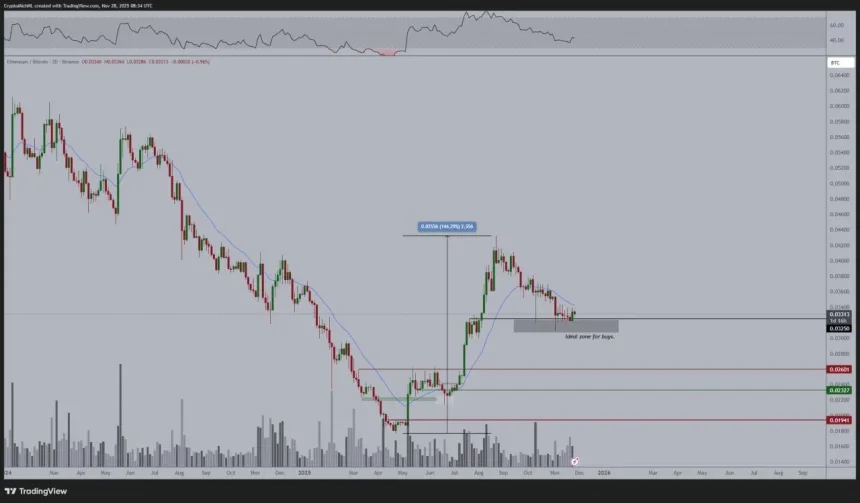 Meanwhile, Ethereum trades inside a falling channel after a 144% historical swing highlighted on the chart, followed by a long correction from March 2025 highs. The 3-day candles compress near multi-month horizontal support between 0.03237 BTC and 0.02601 BTC, showing a defined institutional band viewed as downside exhaustion areas.