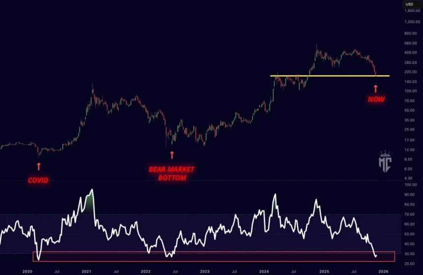 Crypto trader Mister Crypto says Strategys MSTR shares have reached an oversold level seen only twice before on the chart. In a post on X, he highlights a momentum indicator that has dropped back into the same low zone touched during the Covid shock in 2020 and again near the bear market bottom in 2022.