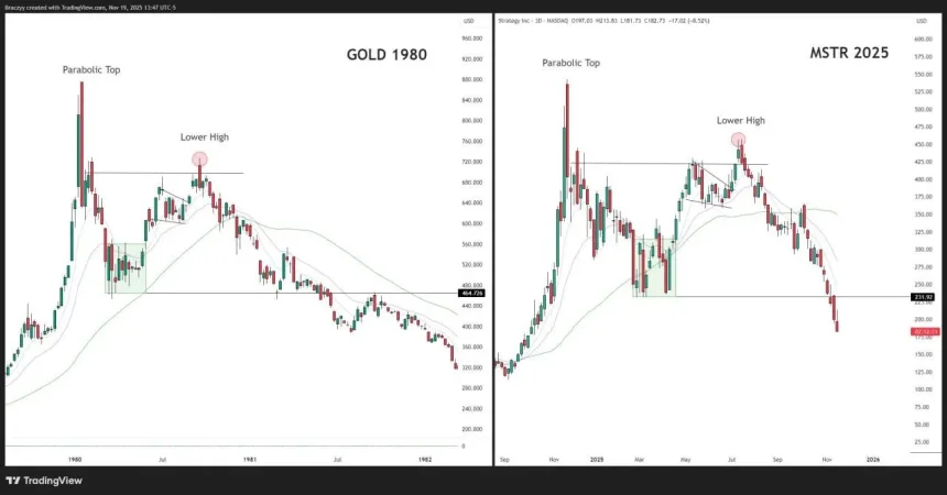 Meanwhile, other crypto trader shared two long-term TradingView charts on X, placing 1980 gold price momentum beside 2025 Strategy (MSTR) share momentum. The side-by-side shows steep upside runs into sell-offs. It also marks a lower-high rejection phase in both markets. The gold chart captures the historic 1980 peak and the decline that followed into 1982. The Strategy chart reflects a similar structure, with price reversing from highs after a visible lower-high test near a horizontal band on the Trend-Strength-3D oscillator.