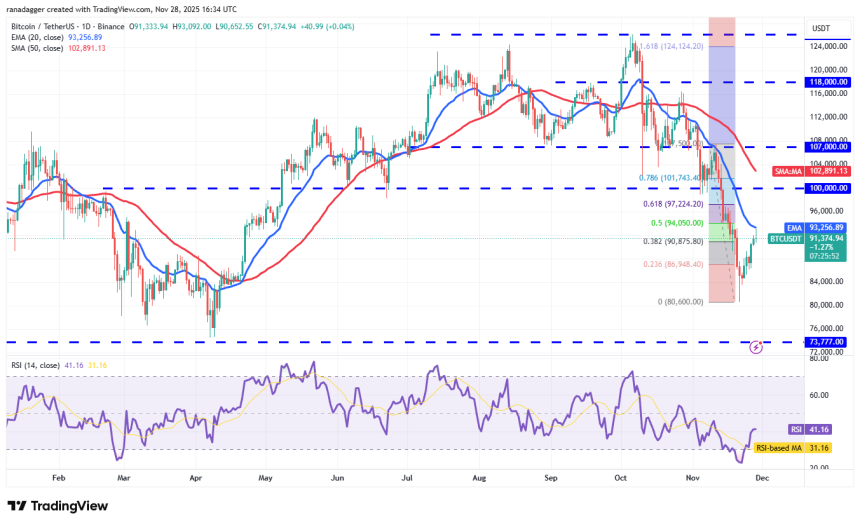 WikiBit 2025-11-29 09:43The recovery in Bitcoin and select altcoins is facing selling at the 20-day EMA, indicating that the bears are attempting to retain control.