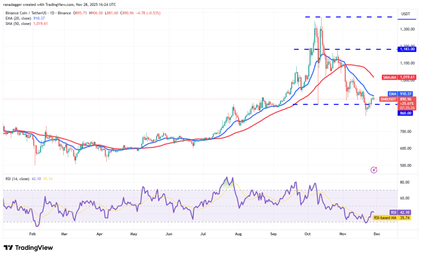 BNB (BNB) rose above the breakdown level of $860 on Monday and has reached the 20-day EMA ($910), indicating buying at lower levels.