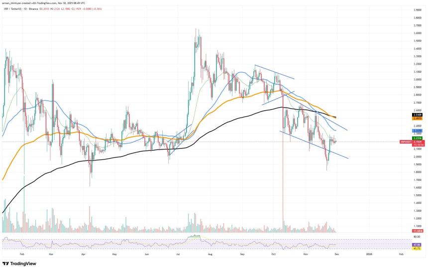 Price action is still far from a confirmed breakout despite this. To reverse momentum, XRP must challenge $2.30, $2.35, and the larger bearish structure would only be refuted by a break above the declining trendline.