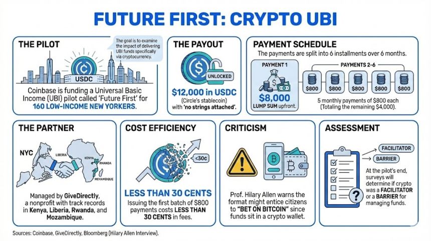 Coinbase is funding a pilot that will deliver $12,000 worth of USDC to 160 low‑income New Yorkers. Managed by Givedirectly, the program will help recipients while studying how the cryptocurrency is spent and exchanged.