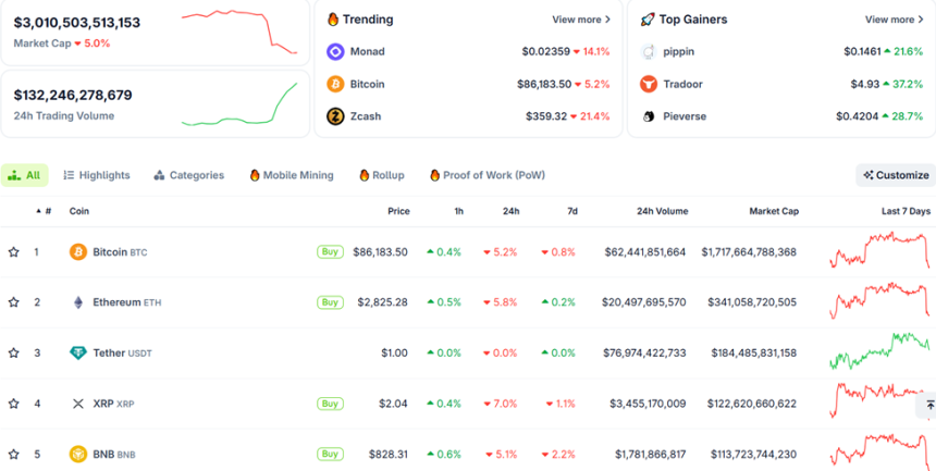 The total crypto market cap declined by approximately 5% over the last 24 hours, with Bitcoin and Ethereum prices falling by more than 5%.