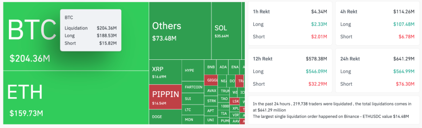 Across the board, a total of $641 million was wiped out of the market in short and long positions, as shown in the figure below.