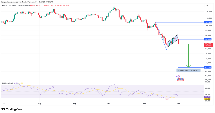 From a technical perspective, the price has validated a bear flag on the daily chart after dropping below the lower boundary of the flag at $90,300 on Monday.