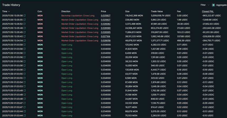The trader built long exposure near the $0.034 level, but a sharp intraday reversal sent MON tumbling from its peak, triggering a cascade of liquidations. Although MON gained nearly 99% at one point within the 24-hour window, the rapid downturn visible on the price chart erased the traders positions almost instantly.