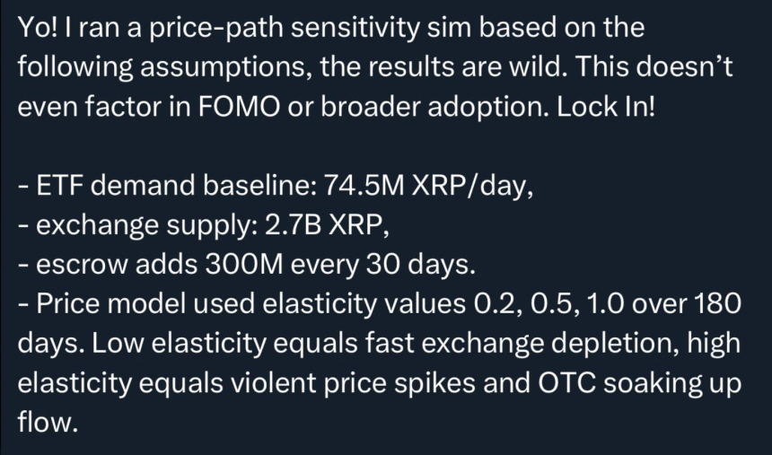 A price-path sensitivity simulation run by Mohamed Bangura was shared by analysts and taken up by commentators. The model used a baseline ETF demand of 74.5 million XRP per day, total exchange supply of 2.7 billion XRP, and an escrow release of 300 million XRP every 30 days.