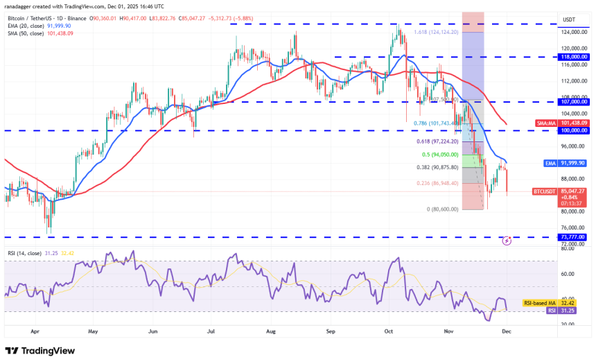 If the Bitcoin price closes below $84,000, the BTC/USDT pair could collapse to $80,600. Buyers are expected to aggressively defend the $80,600 to $73,777 zone. On the way up, the bulls will have to push and maintain the price above the 20-day EMA to signal strength. The pair could then rally to the 50-day SMA ($101,438).