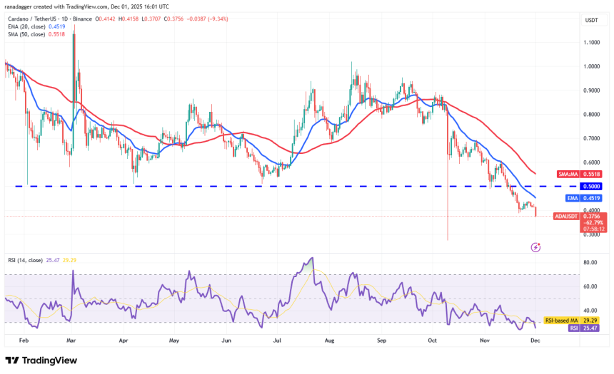 The bears are attempting to start the next leg of the downward move below the $0.38 support in Cardano (ADA).