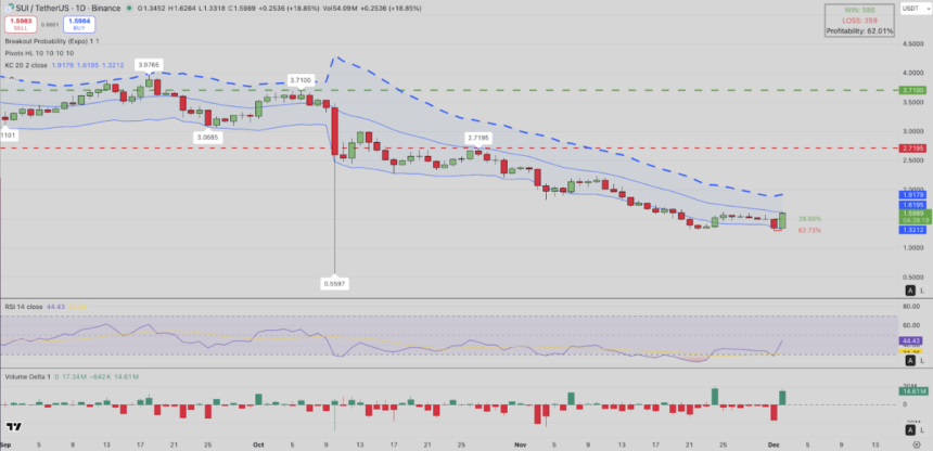 On the downside, $1.32 remains the main support. It aligns with the lower Keltner boundary and served as the consolidation base through late November. Losing this level would pull SUI back into a continuation of the November sell-off, exposing the October lows at $0.56.