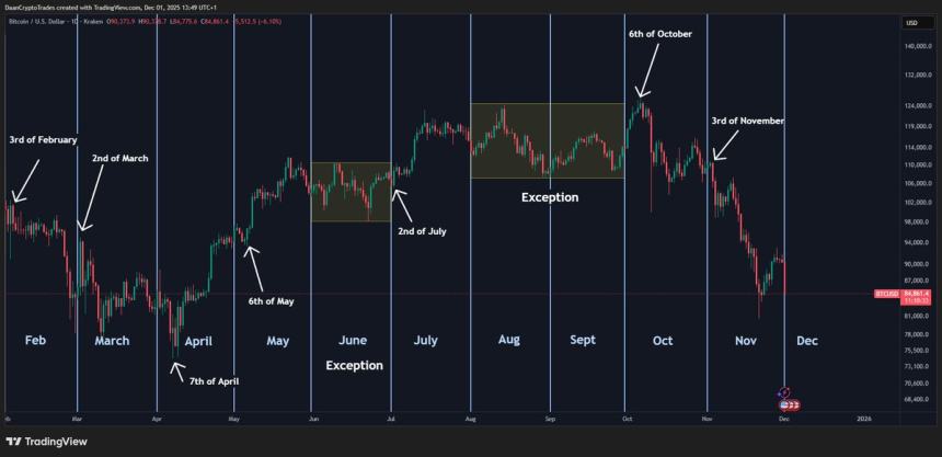 Sharing a year-to-date chart on X, trader Daan Crypto Trades highlighted a recurring pattern in 2025: Bitcoin often sets its monthly extreme early. “We know by now that the first move does often create the monthly high or low within the first ~12 days,” he wrote. “This happens about 80% of the months.” His chart marks how February‘s low, March’s high, April‘s low, May’s low, Julys inflection, and the key October and November pivots all occurred within that window, with June and August flagged as exceptions.