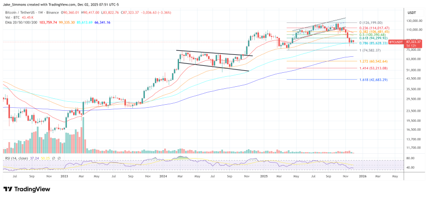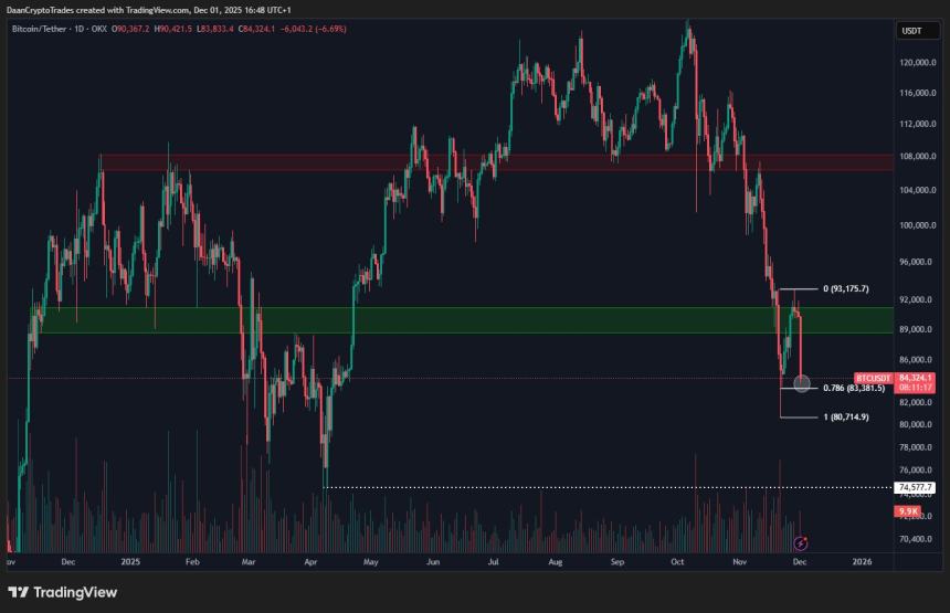 “BTC rejecting from the previous support & resistance area,” he wrote. “Not something you want to see as a bull. Price saw a decent +15% relief rally but has lost steam again after a week already.” On that same chart he plots a short-term Fibonacci retracement from the $93,175 local high down to the $80,714 low. The 0.786 retracement level sits around $83,381, close to spot at the time of posting.