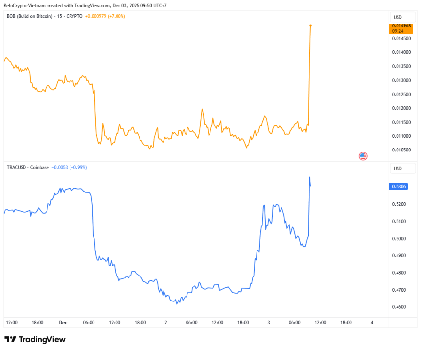 BOB is a protocol that combines ZK proofs and BTC staking to create native bridges to Ethereum and Bitcoin (BitVM). OriginTrail is an ecosystem building a trusted knowledge infrastructure for artificial intelligence. After the listing news, BOB gained 24% and TRAC rose more than 13%.