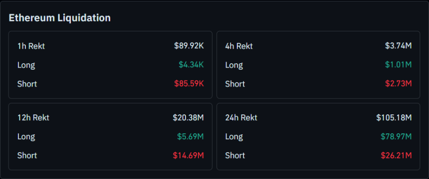 Further, liquidation data shows how violently leverage has been reset around Ethereums latest move. Over the past 24 hours, roughly $105.18 million in positions have been wiped out, with about $78.97 million in longs liquidated versus $26.21 million in shorts. That skew toward long liquidations confirms that the first leg of the move was driven by aggressive selling, forcing over-leveraged bullish traders out of the market.