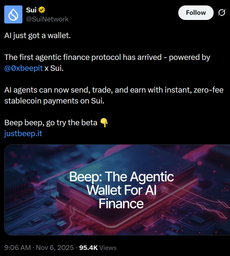 Meanwhile, agentic finance protocol Beep recently launched a wallet on the Sui network, enabling AI agents to send and receive stablecoin payments with zero transaction fees.