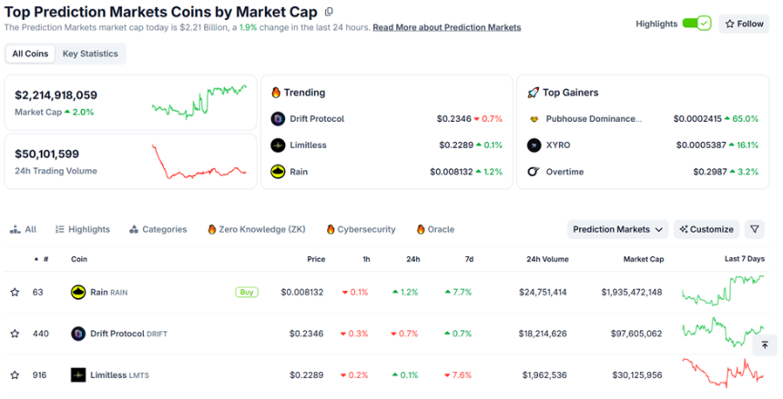 CoinGecko data shows the category reaching a $2.23 billion market cap, with $49.2 million in 24-hour trading volume. Trending assets include Limitless, Drift Protocol, and Rain, among others.