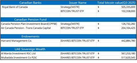 Combined United Arab Emirates sovereign exposure hit $1.08 billion. This is the fourth-largest global holder after U.S. institutions. Al Warda Investment RSC Ltd. significantly expanded its iShares Bitcoin Trust by 230 percent to 7.96 million shares, totaling $518 million. Mubadala Investment Corporation added a new position valued at $567 million.