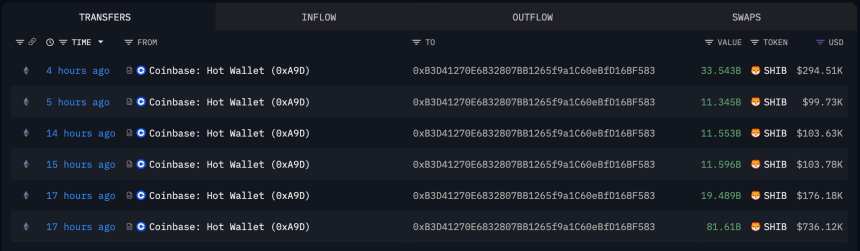 Arkham shows six incoming transfers from the same Coinbase hot wallet, landing one after another across a tight 17-hour window. The sizes jumped from 11 billion SHIB to 81 billion SHIB, signaling that this was not a casual pickup but rather a controlled sweep.