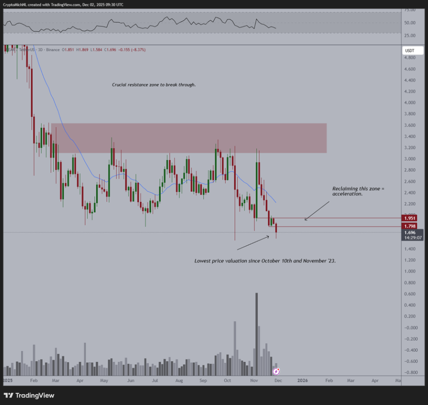 Momentum now depends on whether the token can reclaim $1.80 and advance toward $1.95, a zone that historically supported continuation during prior rebounds. According to the analyst, Break through $1.80 & $1.95 and then we should be good to go upwards from here. The breakdown from the $2.20 to $2.40 range in November intensified the decline, and large-volume sessions around the $2.00 breach suggested heavy supply pressure.