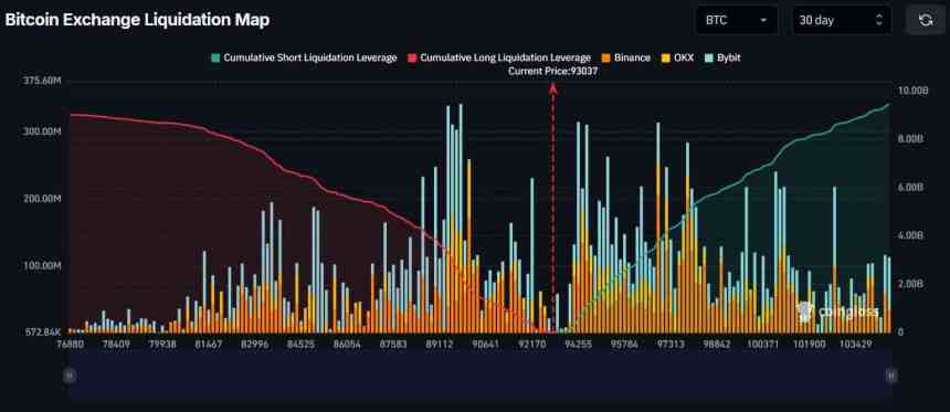 Put simply, around $5 billion is currently positioned against the cryptocurrency, with higher liquidation concentrations stretching toward the $98,000 region.