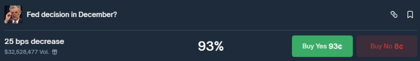 As mentioned, with Bitcoin holding above $93,000 at the time of writing, mostly lifted by optimism that the upcoming Federal Open Market Committee (FOMC) meeting will see another rate cut. In fact, traders now believe there is a 93% chance of it happening, according to crypto-based prediction platform Polymarket.