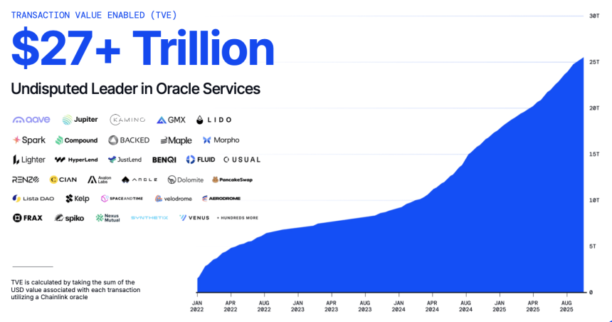 According to the data, Chainlinks Transaction Value Enabled (TVE) surpassing $27 trillion showing how central its services have become in the broader tokenization economy.