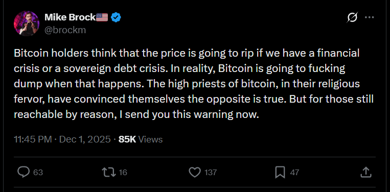 (Brock posted a dire warning about the future of bitcoin on Monday evening Mike Brock on X)
