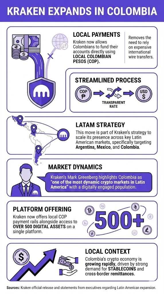 Kraken is now allowing Colombians to fund their accounts with Colombian pesos, expanding the reach and functionality of its services in the country. Mark Greenberg, Krakens Global Head of Consumer, stated that this upgrade offers Colombians secure entry points into crypto.