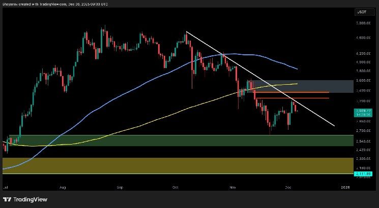 Ethereums rebound from the $2.6K support zone extended into a key supply area, where a daily FVG converges with a long-standing downward trendline near $3.2K.