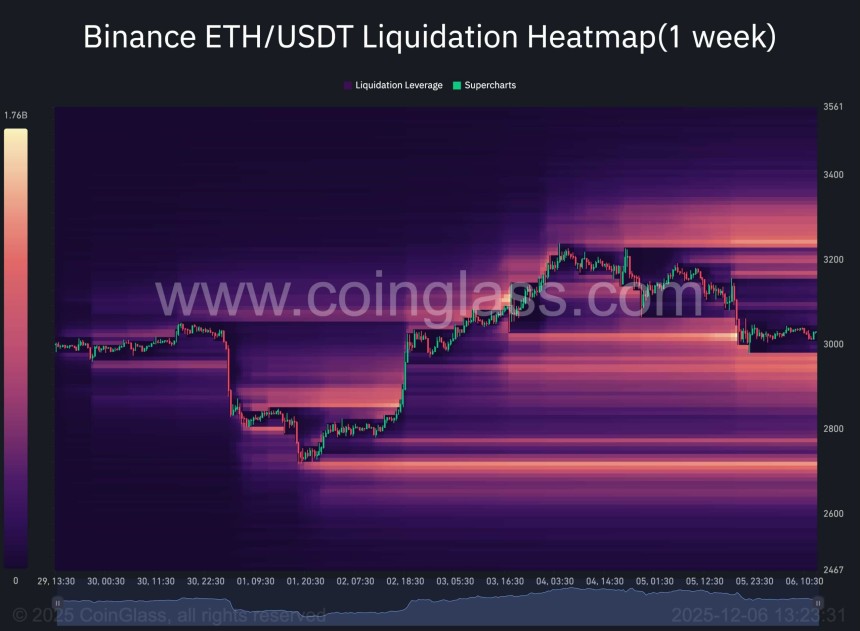 The weekly liquidation heatmap shows that the recent rejection was accompanied by a sweep of the liquidity pool, which sits just below the $3032 market low, capturing buy-side liquidity.
