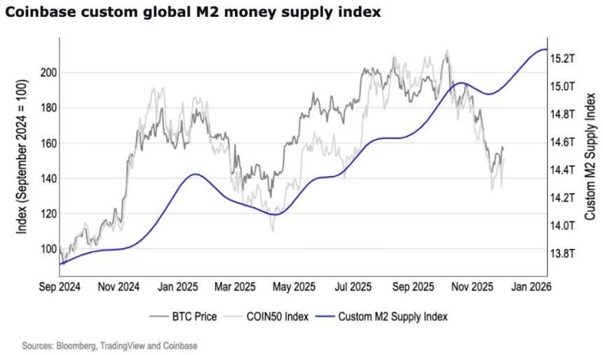 The institutional arm of Coinbase also shared an image illustrating its custom global M2 money-supply index, showing bitcoin‘s price, the COIN50 Index, and its M2 supply gauge. The visual highlighted a rising liquidity trend through late 2025 even as crypto prices oscillated, reinforcing the institution’s view that systemic liquidity may be turning more supportive.