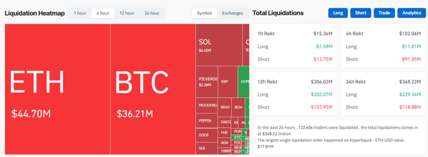 Data from Coinglass confirms the scale of the damage. Over the past 24 hours, 121,628 traders were liquidated, resulting in total liquidations of $346.67 million.