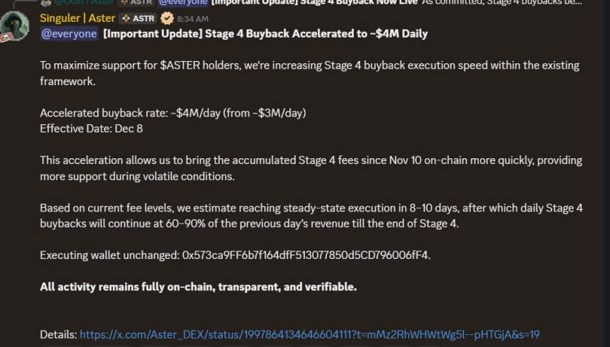 Aster will begin an accelerated Stage 4 buyback program on December 8, 2025, purchasing about $4 million in tokens each day for up to 10 days. The aim is to reduce volatility and support token holders through strategic liquidity management.