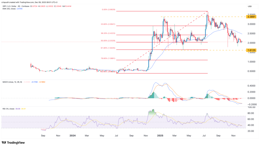 The three-day chart shows that the XRP price has been under pressure in the past few months as it crashed from the all-time high of $3.66 to the current $2.05.