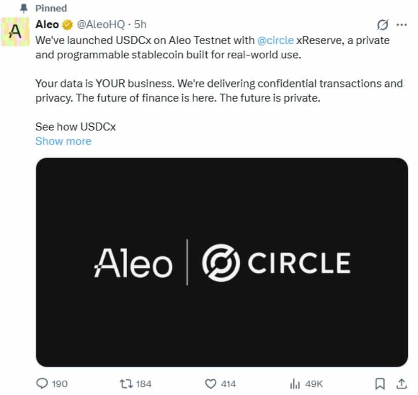 USDCx has been announced for Aleos testnet, letting developers experiment with privacy-focused applications once it becomes available. The mainnet launch is expected by the end of January 2026.