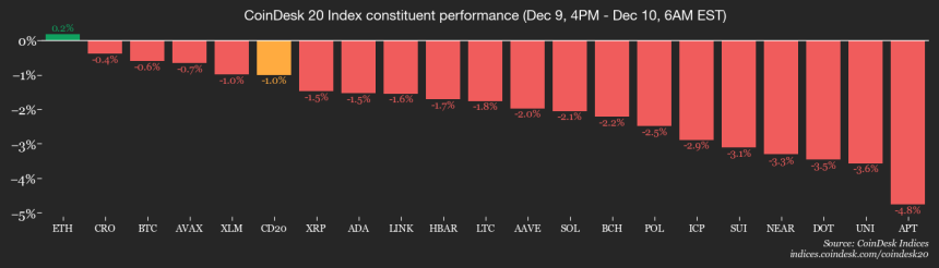 The ADA/BTC pair also advanced, touching its strongest level since Nov. 20. Bitcoin BTC$92,033.03 dropped back after briefly popping to $94,500 late Tuesday. ETH, ADA and privacy coins XMR and ZEC all jumped more than 7% in 24 hours, while SOL, DOGE, XLM, LINK and HYPE rose around 2%.
