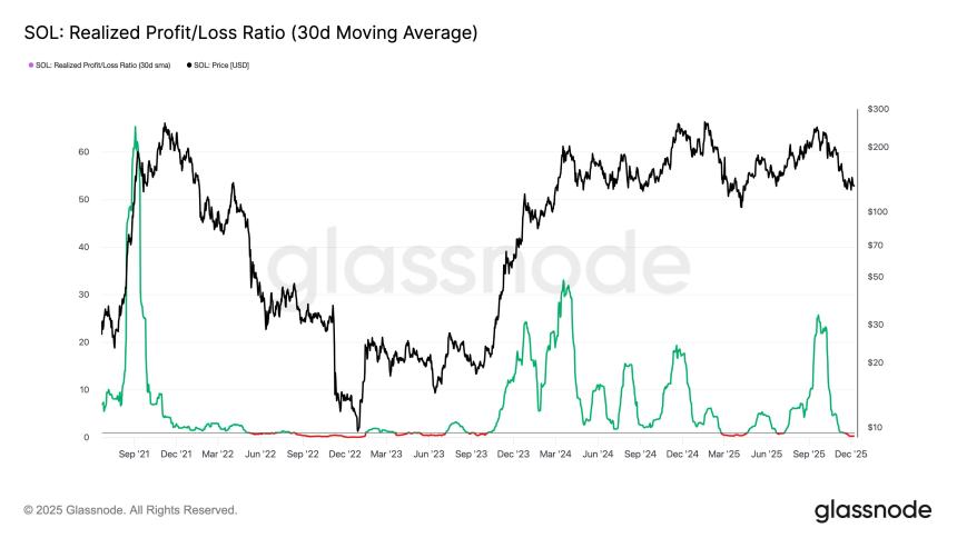 On-chain data shows the Solana Realized Profit/Loss Ratio has dipped into the loss-taking zone recently, a sign that SOL liquidity has thinned.