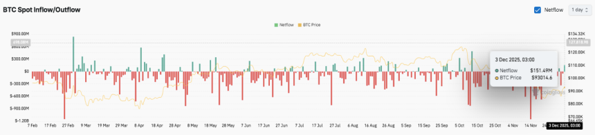 Flows finally turned meaningfully positive. BTC ETFs drove the bulk of the move ($287 million), ETH had its best day since Oct. 28 ($142 million) and SOL contributed marginally ($16 million). This is the first clean signal of risk appetite returning after nearly a month of choppy to negative prints. The flow spike likely reflects short-term positioning ahead of catalysts such as FOMC, inflation data, and jobs. It can also be attributed to quarter-end optics, as allocators often re-express benchmark exposure into liquid wrappers during macro-heavy weeks.