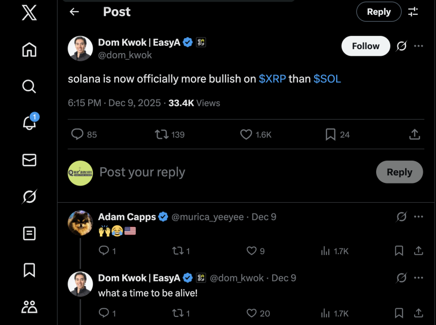 Given the back-to-back XRP-themed posts from Solana, renowned commentators like Dom Kwok have interpreted this to mean Solana is showing more optimism for XRP than for its own SOL token. “What a time to be alive,” he added.
