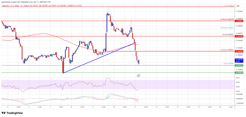 WikiBit 2025-12-11 17:03Dogecoin started a fresh decline below the $0.1450 zone against the US Dollar. DOGE is now consolida