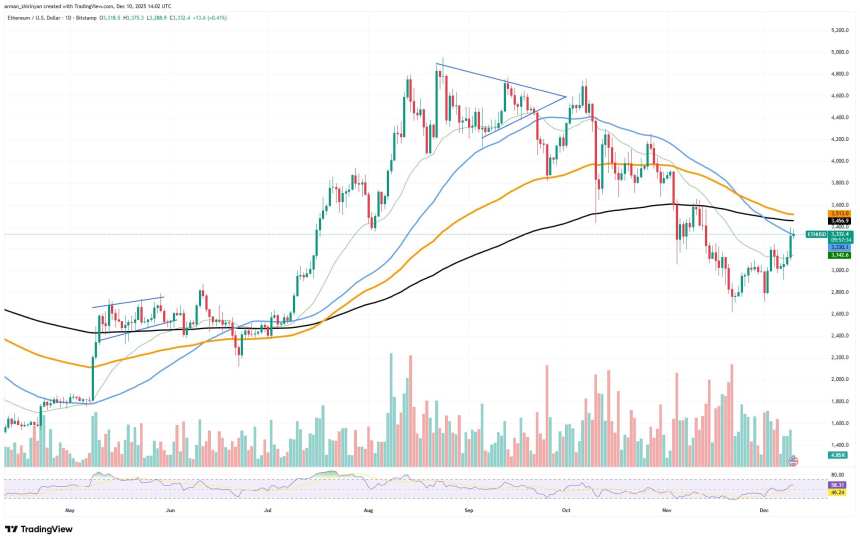 Since the entire correction phase started in mid-October, Ethereum is exhibiting its strongest recovery momentum. The market has stopped bleeding, rebuilt its structure and is now putting pressure on its first significant technical ceiling, the 50-day EMA, which is currently hovering just above the $3,350 area. For almost two months, this level has served as dynamic resistance, thwarting every attempt to move higher, but the current strategy is essentially different.