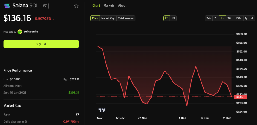 Despite the landmark nature of the transaction, Solanas native token, SOL, has shown a limited price reaction. As of December 12, SOL trades at approximately $136, down 2.25% over the past week. The token briefly spiked above $145 on December 9-10 before retreating to current levels.