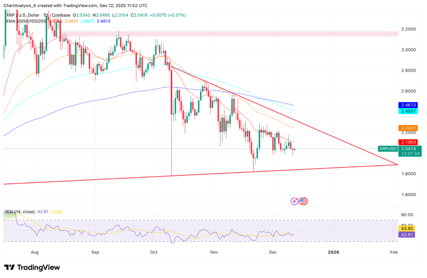 XRP price today trades near $2.04, holding just above short-term support as sellers continue to defend a descending trendline that has capped every rebound since October. Despite the launch of a U.S. spot XRP ETF and fresh developments expanding XRPs DeFi reach, price action remains constrained, reflecting a market that is still digesting positioning rather than chasing momentum.
