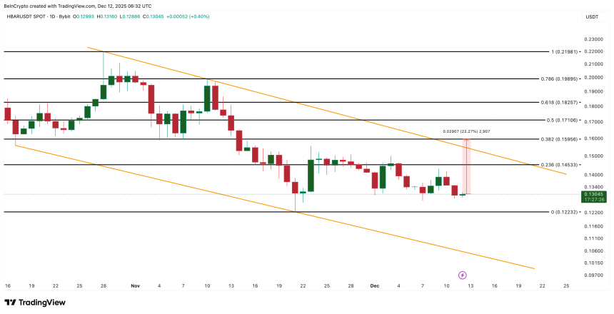The HBAR price needs a daily close above $0.159. This level wasn‘t breached during the previous bounces. A breakout above it also breaks the wedge’s upper trend line and opens room for a move toward $0.198 and $0.219.