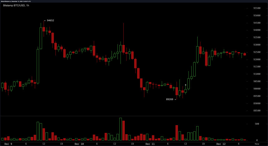 The 1-hour chart, bitcoin‘s version of short-term gossip, shows a market cooling off after a quick flirtation with $94,652. A pullback ushered the price back toward $92,000–$92,500, where it now idles like an engine on low. The momentum oscillator (momentum) is flashing 1,060—a classic overextension signal—while the relative strength index (RSI) at 49 confirms the malaise. With volume drying up, short-term players may find themselves stuck in quicksand unless a catalyst jolts the chart back into motion. Until then, it’s all side glances and sideways candles.