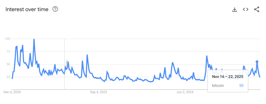 During the week of Aug. 10 through 16, bitcoin logged its second-highest level of interest, according to Google. That stretch marked the first time bitcoin pushed past the $120,000 range, closing at $120,153 on Aug. 13 and tagging $123,497 the very next day. On Nov. 16, that week however, bitcoin was trading below the $100,000 range after slipping through a key support zone three days earlier.
