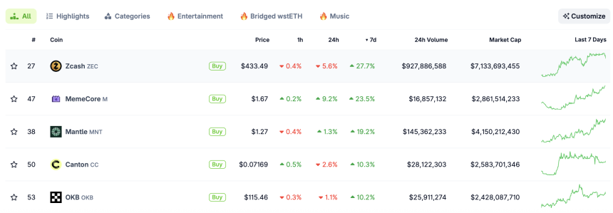 In the last seven days, ZCash (ZEC), a large-cap privacy coin, added almost 28% in price. Earlier today, it hit $368, which is the highest price level since Nov. 29. Meme cryptocurrency MemeCore (M), its closest rival, is only up by 23%.